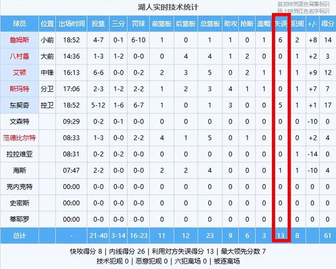 东契奇17分1板3助、詹姆斯15分1板1助、艾顿12分5板2断、斯玛特7分3板4助、范德比尔特4分5板、海斯4分4板、八村塁3分4板1助2断