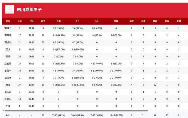 从数据来看,四川队真是全面碾压对手,投篮命中率49.2%对33.3%。三分球30%对25.9%。四川队5人得分上双,周琦只打了19分钟,14投7中,6罚5中,拿到19分12篮板,继续展现出强大的统治力。孙铭徽16分6篮板2助攻,胡金秋12分6篮板,赵岩昊除了上半场命中4球外,下半场6投0中,拿到13分4篮板2助攻。景菡一10分。