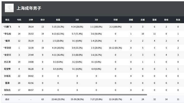上海队的进攻效率极差,全场只拿到63分,是全部3场比赛中最低的。全队3人得分上双,李添荣14投4中,12罚10中,拿到19分5篮板5助攻,李弘权13投8中,拿到19分11篮板,闫鹏飞13分6篮板。