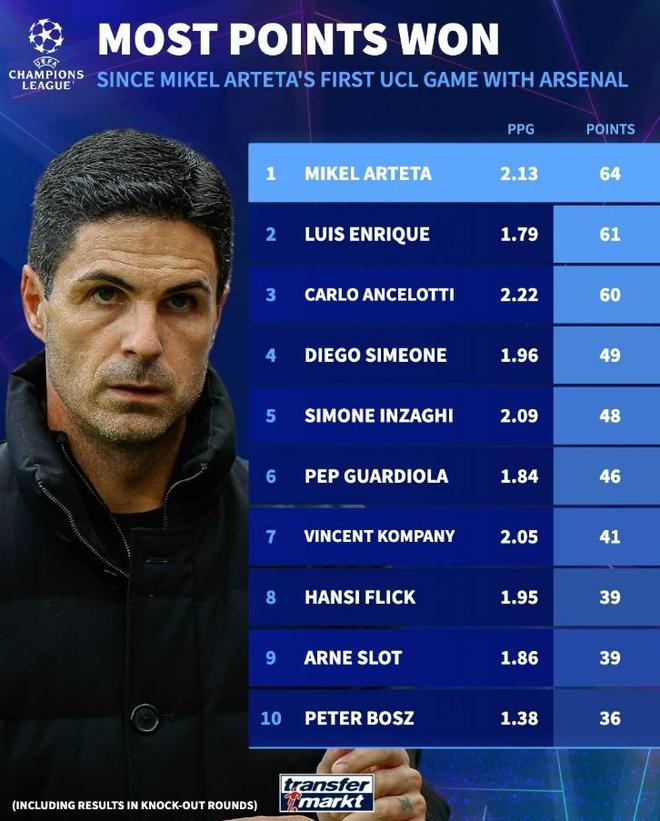 德转也盘点了自阿尔特塔执教阿森纳欧冠首秀以来,各位主帅在欧冠同期积分榜(包括淘汰赛),在跟诸多名帅对比时阿尔特塔丝毫不吃亏,列第一。他场均2.13分、总分64分分别排名第二、第一,不管是哪个层次来看都是在名帅级别的。